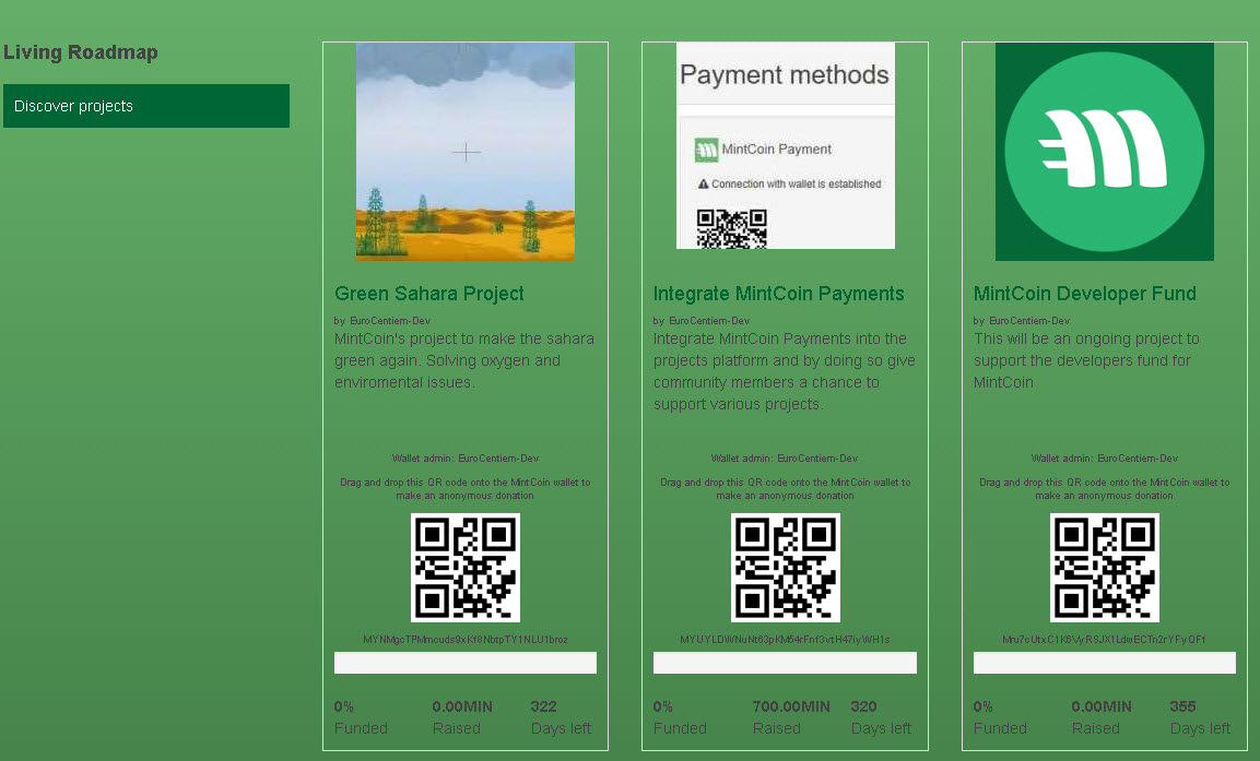 In the first 3 months only the MintCoin team can add projects to the Living Roadmap. After this staging period it will be possible for every community member to add a project and use the existing MintCoin infrastructure and investor network, to expose their idea and to share it on social networks, friends and investors to source funds.